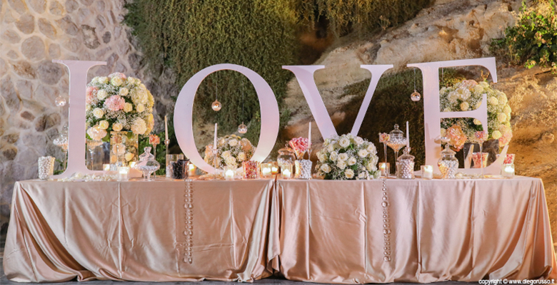 Per il taglio della torta, se amate le scritte, immancabile le lettere a formare la parola LOVE che potete posizionare dove più vi piace e far realizzare in legno, plastica o tramite palloncini; oppure MR e MRS che, come per la parola LOVE, possono essere posizionate sopra la torta oppure nei pressi della zona del taglio.