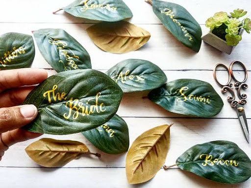 Classiche le pietre o le foglie su cui scrivere il nome del vostro invitato per indicare così il suo posto a sedere. Ammetto che mi sono innamorata di un ferma tovagliolo o forse più una decorazione per il tovagliolo realizzato in legno con il nome scritto in corsivo.